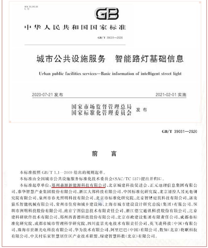10月份,由郑州开元(中国)新能源作为第一起草单位的国家标准《城市公共设施服务 智能路灯基础信息》,获得了国家市场监督管理总局、国家标准化管理委员会批准。