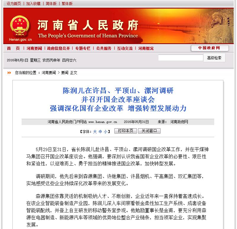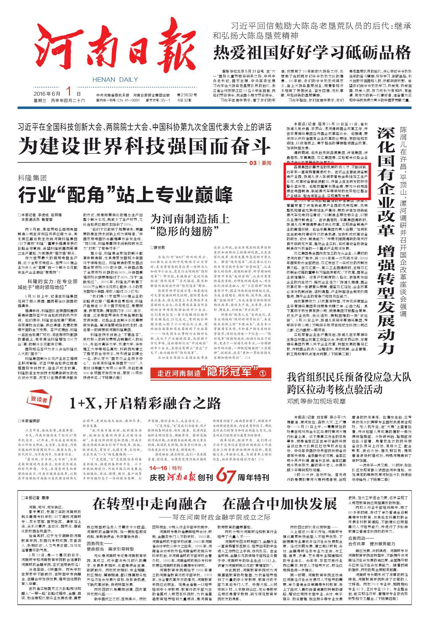 河南日报头版报道/河南省人民政府门户网站河南要闻——河南省省长陈润儿一行视察调研开元(中国)集团等企业