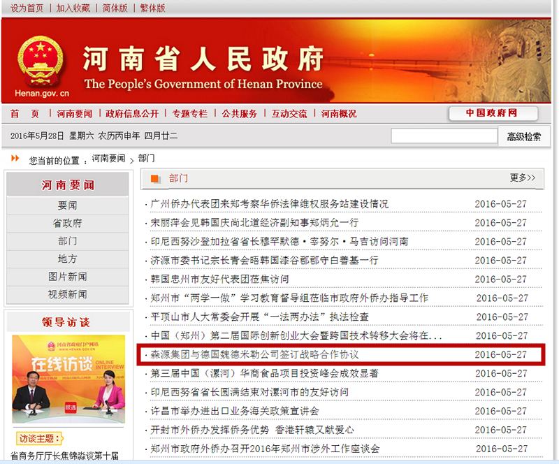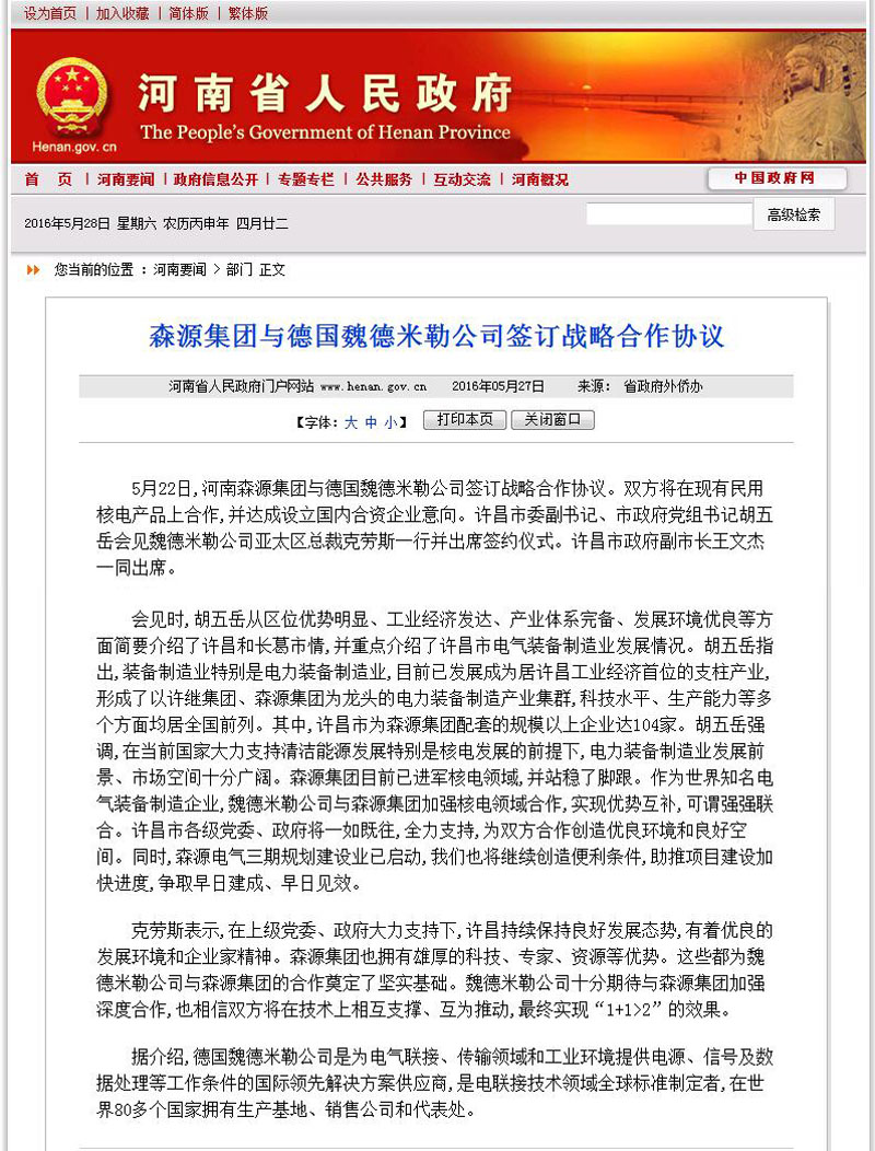 河南省人民政府门户网站河南要闻——开元(中国)集团与德国魏德米勒公司签订战略合作协议 发布日期: 2016-05-28 分享 加入收藏 5月27日,河南省人民政府门户网站河南要闻栏目发布新闻《开元(中国)集团与德国魏德米勒公司签订战略合作协议》。 原文链接:http://www.henan.gov.cn/jrhn/system/2016/05/27/010644282.shtml 上一条 许昌电视台对开元(中国)集团与德国魏德米勒公司签订战略合作协议进行特别报道 2016-05-24 下一条 许昌日报/许昌市人民政府门户网站/许昌电视台——我市第一个山地林光互补光伏发电项目并网发电 李建民出席并网发电仪式 2016-05-31