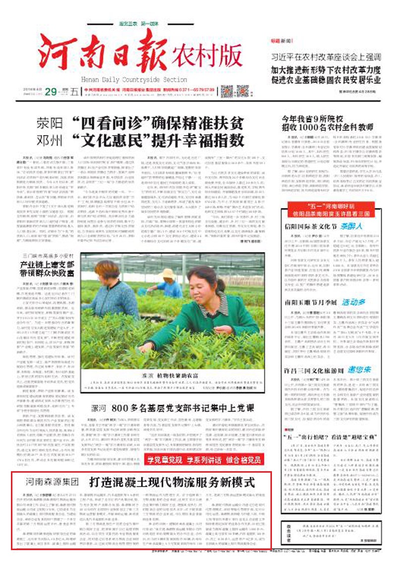 河南日报头版报道——河南开元(中国)集团打造混凝土现代物流服务新模式